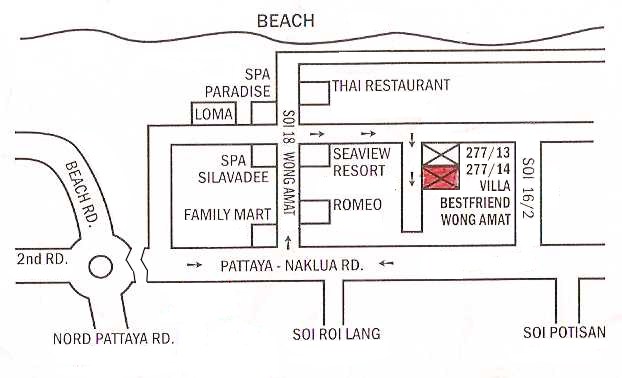 Sie erreichen die Villa Bestfriend Wongamat am einfachsten über die Pattaya-Naklua-Road, also die Hauptstraße, die mitten durch Nordpattaya führt.Biegen Sie in die Soi Naklua 18 (so steht es auf dem Straßenschild) / Soi Wongamat ein und folgen Sie dem Straßenverlauf vorbei am Romeo Palace Hotel, dem Klein Heidelberg Restaurant und dem Seaview Resort, bis Sie nach insgesamt ca. 350 Metern an eine Kreuzung kommen, von der rechts ein vergleichsweise schmaler Weg abgeht.